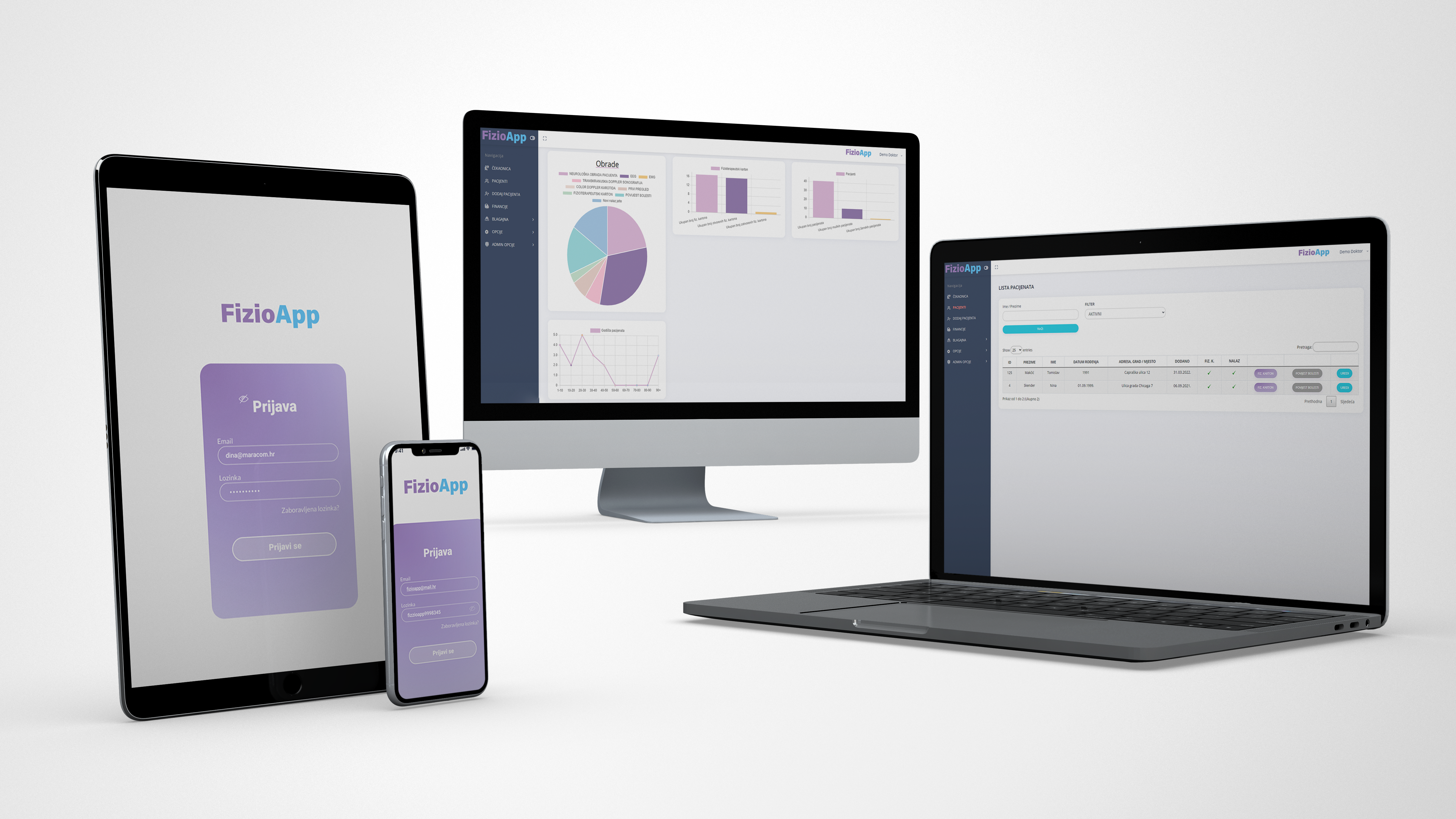 FizioApp je moderna i potpuna aplikacija s jednostavnim pregledom informacija o klijentu, uključujući njegov karton, nalaze, medicinsku dokumentaciju, zakazane termine i financije, kao i fiskalizaciju. Unutar aplikacije je omogućen grafički prikaz statističkih podataka.