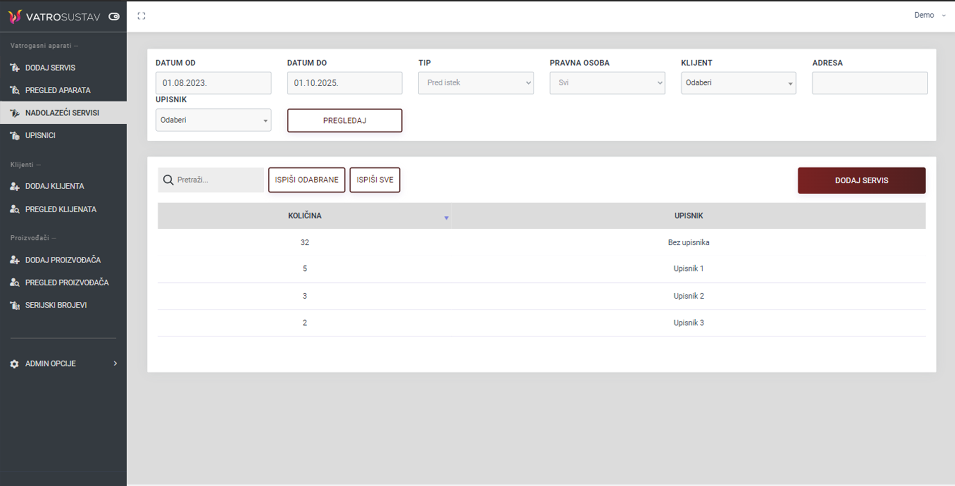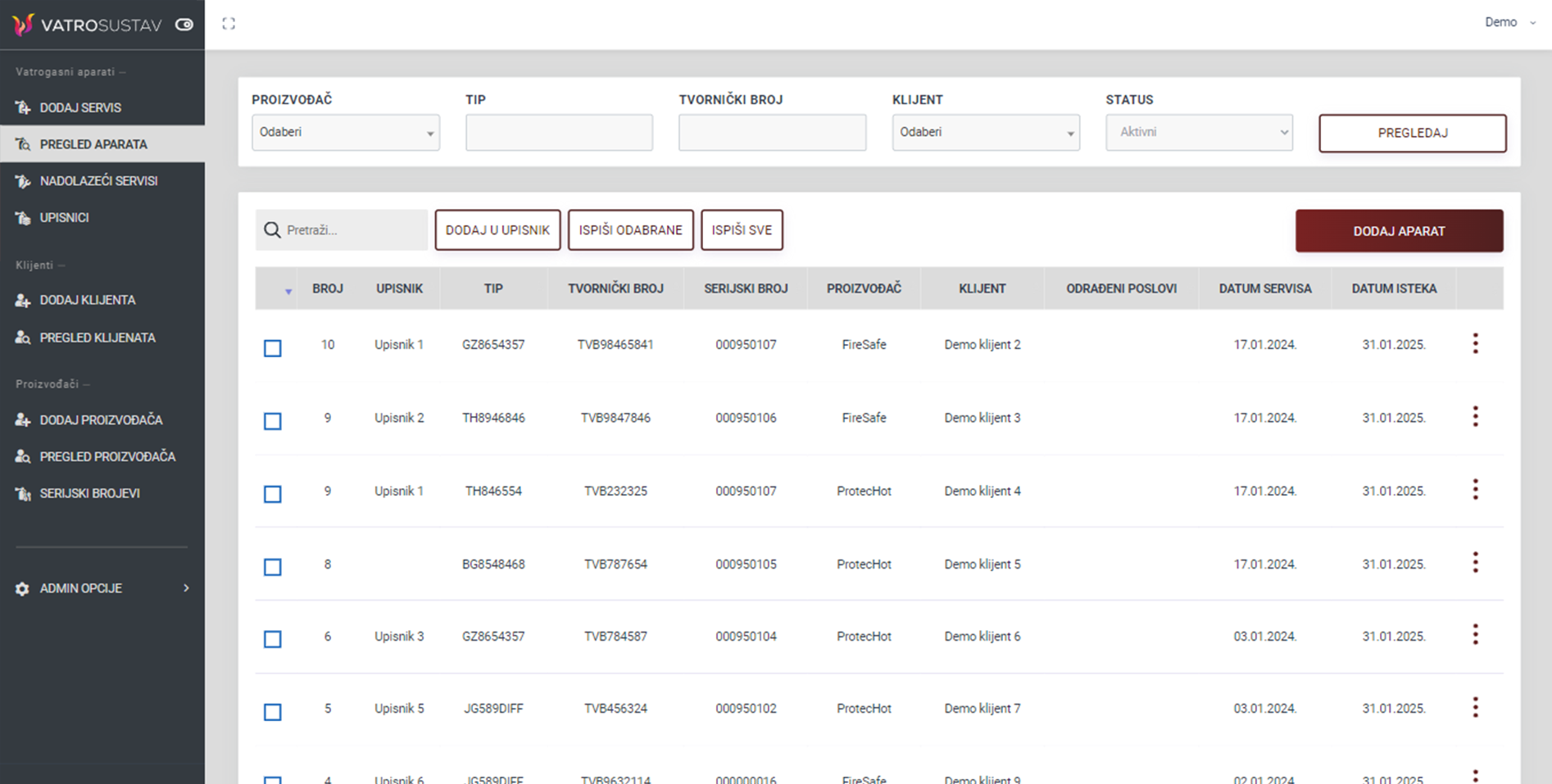 Korisnici aplikacije imaju uvid u sve podatke o provedenim servisima te im mogu vrlo jednostavno pristupiti i filtrirati po imenu, prezimenu, OIB-u, tvorničkom broju aparata te serijskom broju evidencijske naljepnice.